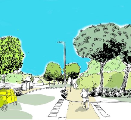 La prise en charge des modes doux est l’enjeu premier du programme confié à l’équipe Chemins de traverse + Céramide. Le choix de deux voies vertes urbaines sur chacune des rives de l’avenue propose un partage des usages entre piétons et cyclistes et résout le sujet de l’accessibilité au site propre.