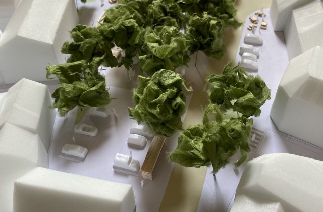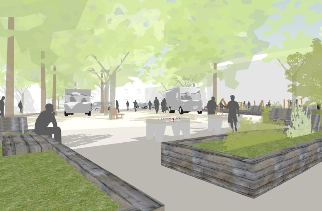 L'équipe de maîtrise d’œuvre, emmenée par Chemins de traverse, requestionne le projet vis à vis des usages futurs notamment : diminution de la place de la voiture, redimensionnement de la place de Marché, activation de l'espace afin d'affirmer la centralité du lieu : aire de jeux pour les petits, offre ludique pour les adolescents, tables, assises et possibilité de jeux de boule pour tous.